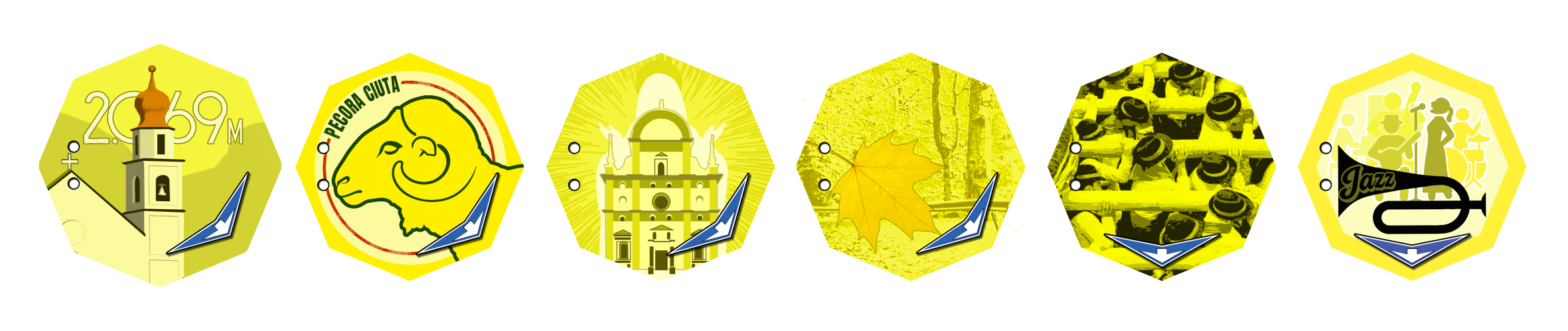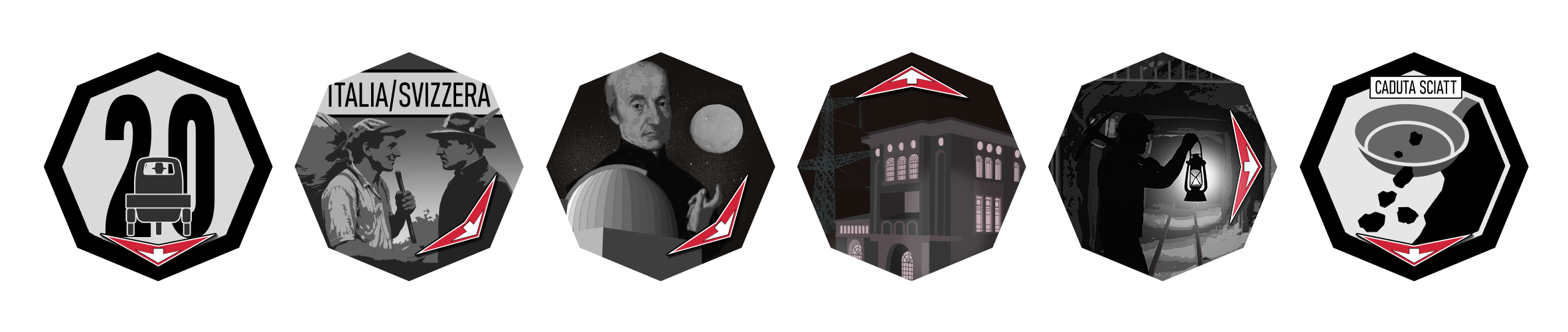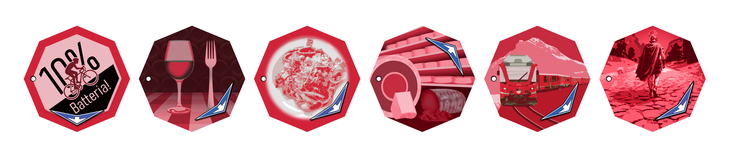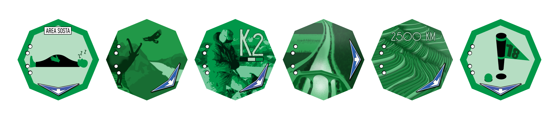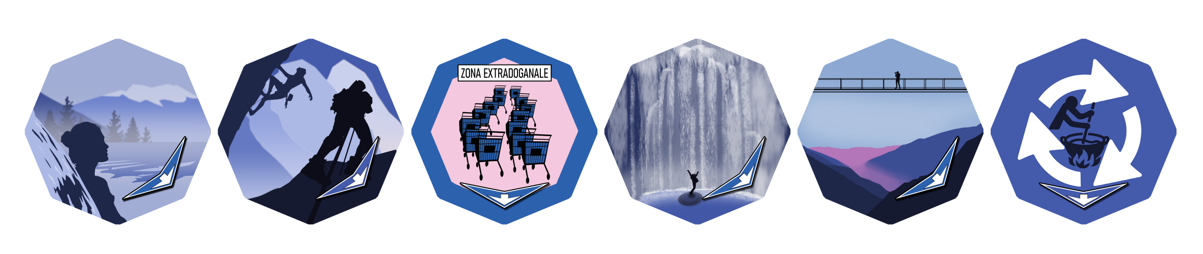 Si parte con la dama bianca (la neve), si incontrano i jolly dal classico colore nero e, tra luoghi reali e pittogrammi reinterpretati con ironia, ogni scudo diventa un piccolo frammento di identità.